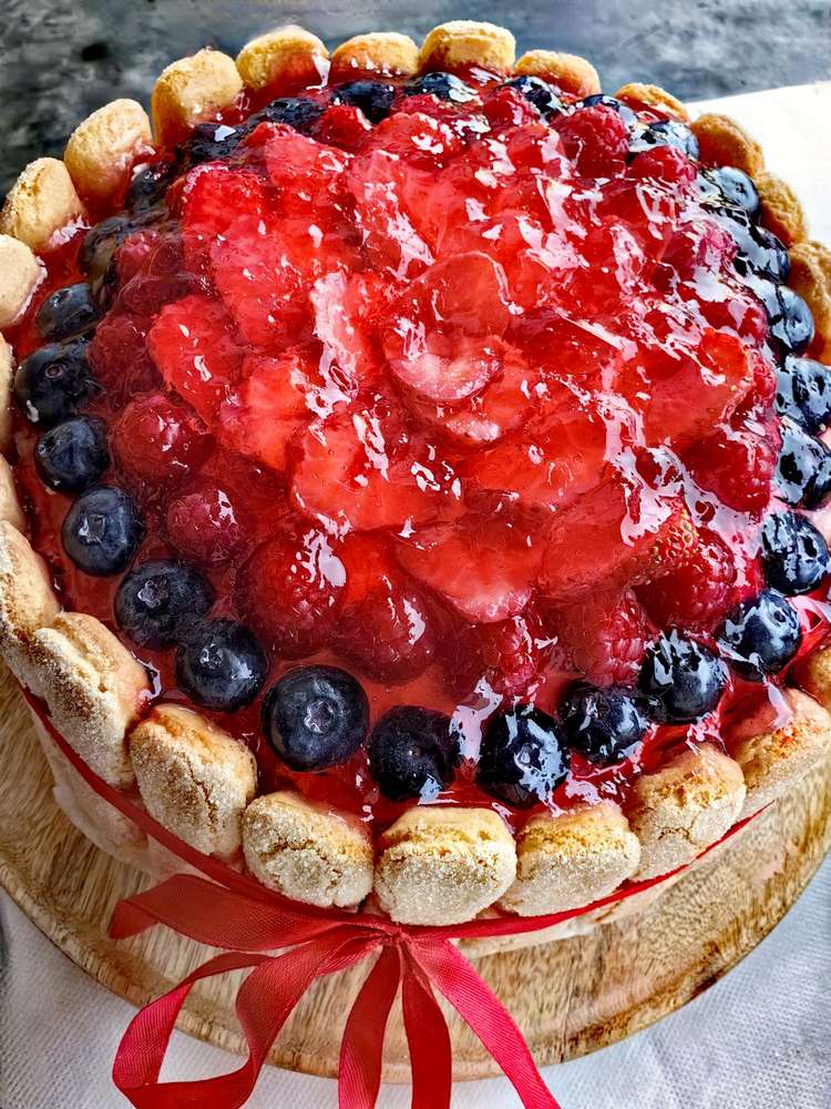 - Do dekoracji końcowej warstwy wykorzystałam pokrojone truskawki i ułożyłam je w formie rozkwitającego kwiatu. Następnie przykryłam nie do końca stężałą galaretką. Boki tortu przyzdobiłam gotowymi biszkoptami i wstążką. Przycięłam je do wysokości tortu, po wyjęciu tortu z tortownicy, kiedy tort już się schłodził przez parę godzin a galaretka nie była już płynna.