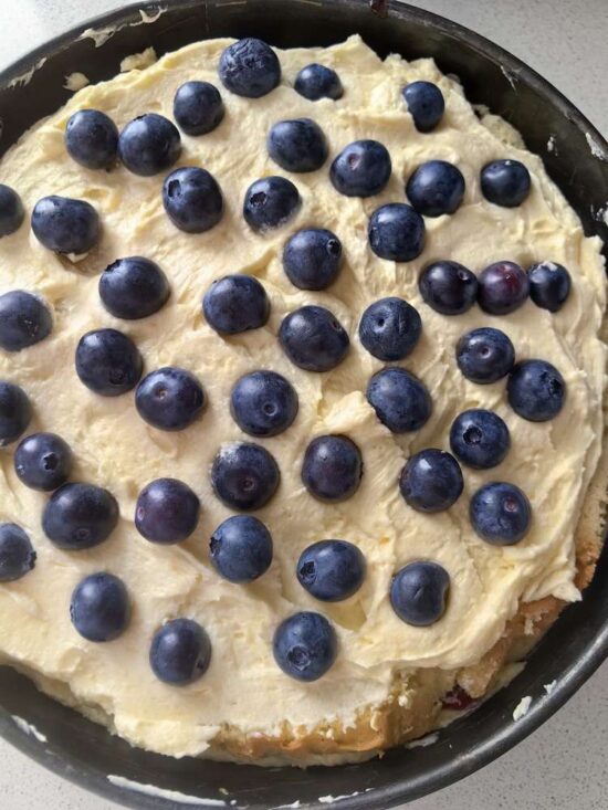 - Ponowiłam czynność, posmarowaam biszkopt kremem, wyłożyłam borówkami, znowu posmarowałam kremem i przykleiłam kolejny biszkopt. Do składania tortu pomogłam sobie tortownicą , aby wyszedł równy.