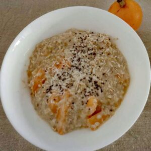 Bardzo często robię owsiankę na śniadanie. Zmieniam tylko owoce i dodatki ze względu na ich dostęność w danym sezonie. Tym razem sięgnęłam po níspero, typowy wiosenny owoc w Hiszpanii o wdzięcznej polskiej nazwie Nieśplik. W swoim wyglądzie przypomina morele , jednak ma dużo drobniejsze pestki i zaskakujący smak. Ma dla mnie orzechową nutę, dlatego pomyślałam, żeby podkreślić ją jeszcze bardziej masłem orzechowym. Podgrzane owoce mają znacznie bardziej wyrazisty smak. W Hiszpanii, często możemy spotkać się z domową marmoladą lub deserem z nísperos w roli głównej. Zapomniałam dodać, że nísperos są bogate w błonnik, witaminę C, B i A.