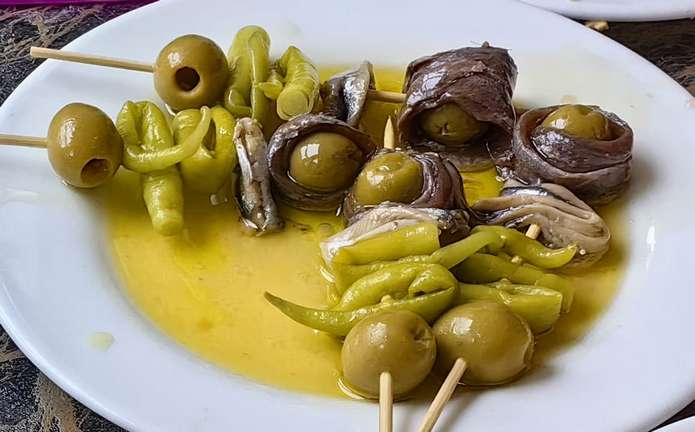 Oprócz pintxos serwowanych na pieczywie typowe przekąski w Kraju Basków to gildas, czyli koreczki z anchois, oliwek i marynowanych pikantnych papryczek.