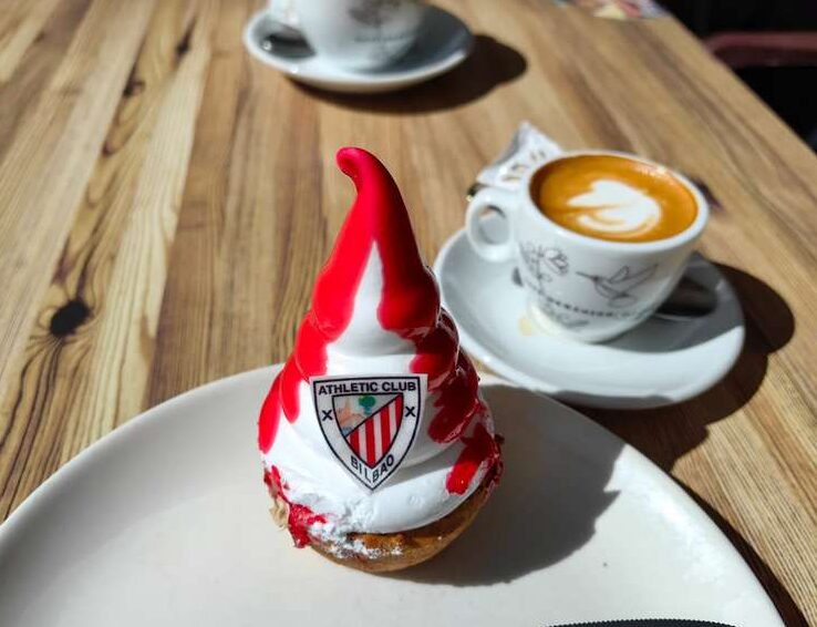 Nie byłabym sobą, gdybym nie spróbowała najpopularniejszego deseru z Bilbao, którym jest Carolina – czyli tartaletka z ciasta francuskiego z rożkiem bezowym, oblanym czekoladą i żółtkiem. Tak się skłąda, że podczas mojego pobytu w Bilbao, klub piłkarski Athletic Bilbao dostał się do finału Pucharu Króla Hiszpanii – Copa del Rey, a więc tradycyjny żółty kolor Caroliny zmienił się na barwy zwycięskiego klubu.