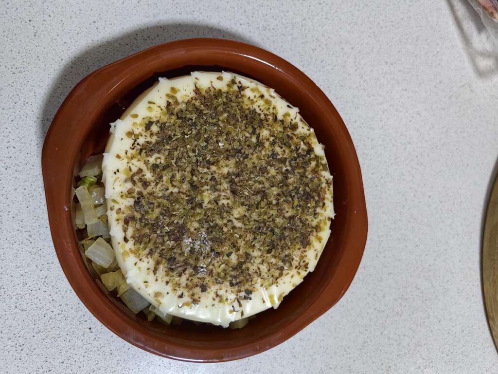 • Podsmażoną cebulkę przekładamy do glinianego naczynia lub naczynia żaroodpornego. Posypujemy suszonymi pomidorkami i przykrywamy je serem w całości.