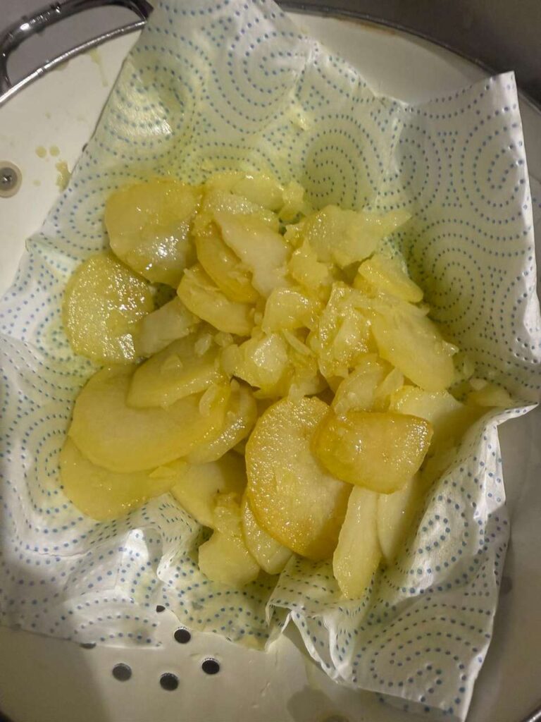 - Następnie łamiace się już ziemniaki i zeszkloną cebulkę przełożyłam na sitko, wyłożone ręcznikiem papierowym,aby pozbyć się nadmiaru tłuszczu.