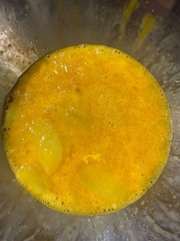 - Wbiłąm 6 jajek do dużej miski i wymieszałam je trzepaczką na jednolitą masę.