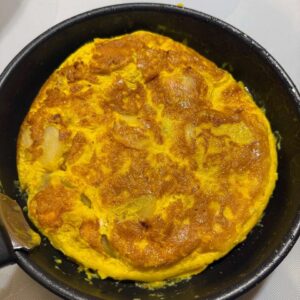 - Teraz najbardziej wymagający moment tego przepisu, a więc ,,la vuelta'', czyli obrót naszego omletu. Możemy obrócić ją za pomocą talerza lub pokrywki od patelni, czy dużego garnka. W Hiszpanii sprzedają nawet specjalne pokrywki do obracania tortilli. 🙂