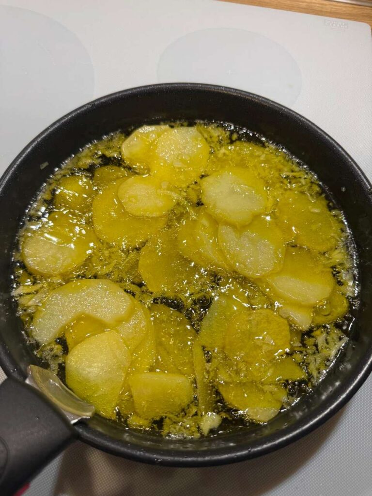 - Podsmażyłam ziemniaki na oliwie na wolnym ogniu, pamiętajac aby były całkiem przykryte oliwą a oliwa delikatnie ,,mrugała''.