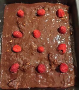 Fit brownie, bez dodatku cukru. Ekspresowy deser z orzechami i malinami.