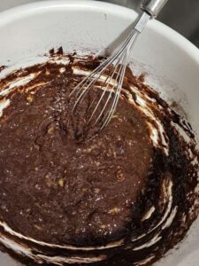 Rozgniatamy banany. Im bardziej dojrzałe, tym słodsze nasze brownie. Dodajemy 2 jajka i dokładnie mieszamy.