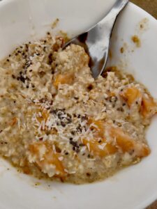 Przekładam owsiankę do miseczki i posypuję wiórkami kokosowymi i nasionami chia.