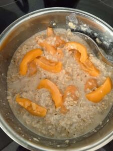 Kiedy widzę,że płatki zaczynają już chłonąć mleko dodaję pokrojone owoce nieśplika oraz masło orzechowe.