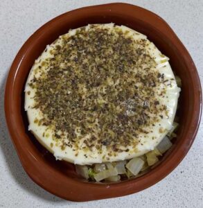 Podsmażoną cebulkę przekładamy do glinianego naczynia lub naczynia żaroodpornego. Posypujemy suszonymi pomidorkami i przykrywamy je serem w całości.