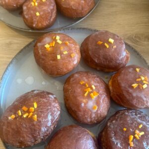 - Mokry lukier posypujemy kawałkami skórki pomarańczowej.