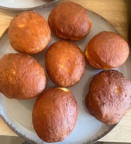 Jak byłam mała, nasz babcia smażyła pączki z domowymi powidłami śliwkowymi lub dżemem wiśniowym. Tym razem znalazłam dżem z płatków róż w sieciówce, co przekonało mnie to podjęcia pączkowego wyzwania. Nie jest łatwo o taki dżem w Hiszpanii.
